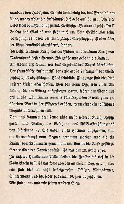 ![]() | I go up to him. "Staff Sergeant Udet returning from flight with the enemy. Two-seater Farman shot down!" He sets his glass down and looks at me. His face shows no movement as if made of stone. "Our large airplane was just brought down over the Isle of Napoleon," he says. I know: Lieutenant Kurth was the pilot and Lieutenant Kurth was Mackenhun's best friend. I salute and go inside. In the evening we were able to review the events of the day. The French air attack, the first large air attack in world history, was repelled. Five enemy aircraft were shot down inside our lines. Of the nine officers of our division, who went up at midday, only three returned in the evening. "You too will be finished off at the Isle of Napoleon!" becomes a banner phrase in the flight service if one wishes to take a foolish risk. Of our ranks three people do not return: Kurth, Hopffgarten and Wallat, the crew of the AEG large aircraft from Division 48. They attacked a Farman, were rammed by the enemy while turning in battle, and crashed in a pile of debris along with them. Right over the Isle of Napoleon. It was March 18, 1916. In our Habsheim villa light shined from our windows deep into the night. Death had been delivered that day, certainly, but this time were were not present. Pfälzer, Weingärtner, Glinkermann and I had each shot down an opponent. We are young and we celebrate our victory. |