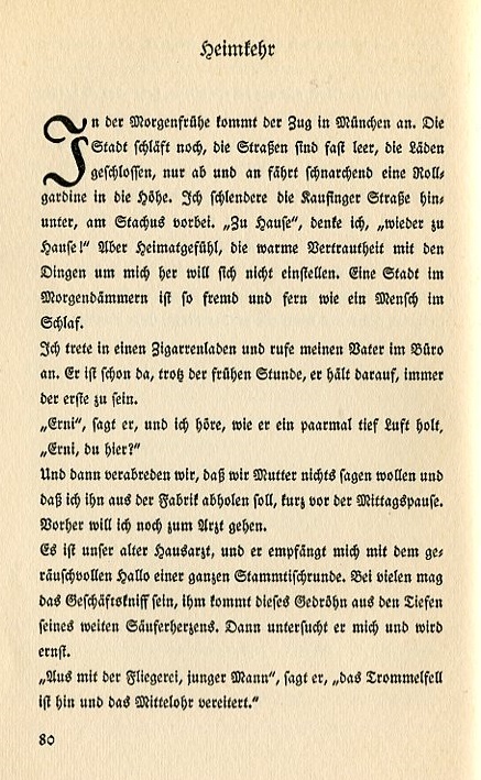 The train arrives in Munich early in the morning. The city still sleeps, the streets are almost empty, the stores closed, here and there a window blind yawns it way opens. I stroll down Kaufinger Street past Stachus. "Back home," I think, "back home again!" But a feeling of home, the warm familiarity with things around me will not engage. A city at dawn is as foreign and distant as a man who's asleep. I enter a cigar store and call my father at his office. He's already there despite the early hour. He's always the first one in. "Erni," he says, and I hear how he takes a couple deep breaths. "Erni, you're here?" Then we talk about things we won't tell mother and I say I'll collect him from the factory shortly before the midday break. Before that I'll go to the doctor. It's our old family doctor and he receives me with a boisterous hello loud enough for an entire table full of people. Some might consider it just good business but this loud roar comes from the depths of his big gushy heart. "You're done with flying, young man," he says. "Your eardrum is ruptured and your middle ear is infected." |