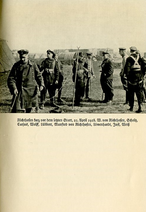 Caption under photograph reads: Richthofen shortly before the last takeoff, April 21, 1918. W. von Richthofen, Scholtz, Carjus, Wolff, Lübbert, Manfred von Richthofen, Löwenhardt, Just, Weiss. |