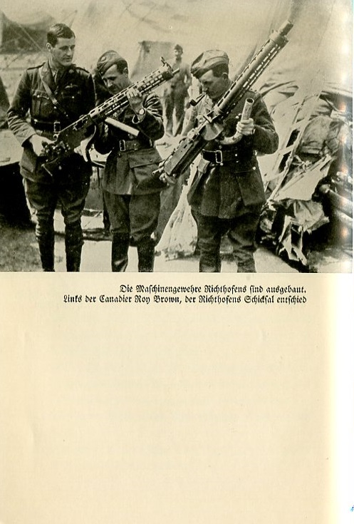 Caption under photograph reads: Richthofen's machine gun is dismantled. Left the Canadian Roy Brown, who decided Richthofen's fate. |