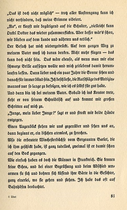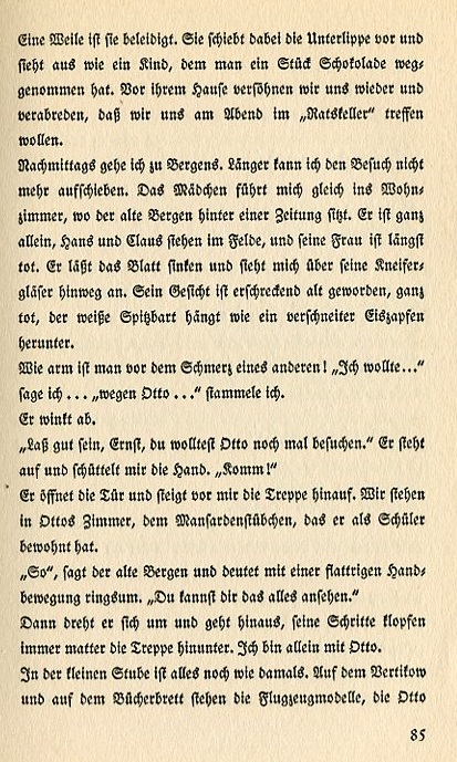 She's offended for a while. She pushes out here lower lip and looks like a child from whom someone has just taken away a piece of chocolate. We reconcile before her house and begin talking again. We'll meet at the "Ratskeller" this evening. In the afternoon I go to Bergen's house. I can't put the visit off any longer. The maid takes me into the livingroom where old Bergen sits behind a newspaper. He is all alone, Hans and Claus are in the field, and his wife has been dead a long time. He lets the paper slip down and looks at me over his pince nez. His face has grown dreadfully old, almost dead; the white goatee hanging like a snowy icicle. How feeble one is before the pain of another! "I wanted to..." I say..."because Otto..." I stammer. He gestures to me. "It's fine, Ernst. You'll see Otto again." He stands up and shakes my hand. "Come!" He opens the door and climbs the stairs ahead of me. We stand in Otto's room, the little room with the Mansard roofline he lived in as a student. "So," old Bergen says and indicates with a movement of his flapping hand."You can think about things here." Then he turns around and leaves, his footsteps dully thumping down the stairs. I'm alone with Otto. Everything is as it always was in this small room. On the dresser and the bookshelves stand the airplane models Otto built himself. |