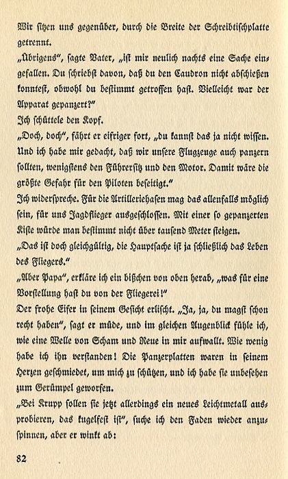 We sit opposite each other divided by the width of the desktop. "By the way," father said, "recently one evening something occurred to me. You write that you couldn't shoot down the Caudron even though you were certain you hit it. Perhaps the plane was armored?" I shake my head. "Of course," he continues eagerly, "you couldn't know that. And I thought we should armor our planes also, at least the cockpit and the engine. That would eliminate the greatest danger to the pilot." I disagree with him. That might be possible for the artillery transports but it's not acceptable for fighter planes. With such an armored crate one couldn't get above a thousand meters. "That's irrelevant. The important matter is ultimately the life of the pilot." "But Papa," I state a little taken aback, "what do you think aviation is all about?" Joyous enthusiasm drains from his face. "Yes, perhaps you are right." he tiredly says and in the same moment I feel a wave of shame and regret wash over me. How little I understood him! He thought with his heart while designing the armor in order to protect me and I thoughtlessly tossed it in the scrap pile. "In any case at Krupp you should investigate the new lightweight metal that's bulletproof," I attempt to mend the fence, but he declines. |