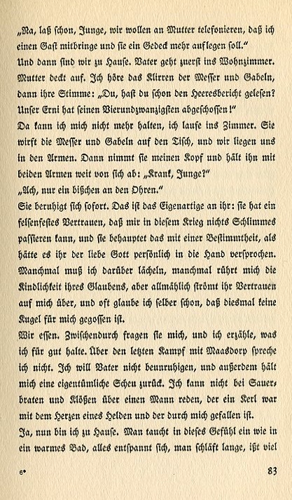 "Nah, let it go, boy. Let's call your mother and tell her I'm bringing home a guest and she should set another place." And then we go home. I hear the clinking of knives and forks then her voice, "Dear, have you read the army report? Our Erni has shot down his twenty-fourth plane!" I can no longer restrain myself. I fun into the room. She tosses the knives and forks on the table and we rest in each other's arms. Then she takes my head and holds it with both arms in front of her. "Are you sick, boy?" "Oh, just a little in my ears." She immediately calms down. That's the unique thing about her. She has a strong as granite conviction that nothing bad is going to happen to me in this war and she maintains it with such certainty it's as if our beloved God has personally promised this to her. Sometimes I laugh about it, sometimes I'm moved by her childlike faith, but mostly her confidence just infuses me and I often believe the same thing myself. I believe there's no bullet at this time with my name on it. We eat. Throughout the meal they asks me things and I tell them what I think is appropriate. I say nothing about the last battle with Maasdorp. I don't want to disturb father and besides which, a certain hesitancy holds me back. I can't talk about a fellow with the heart of a hero who died because of me over roast beef and dumplings. Yes, I'm home. One surrenders to this feeling like a warm bath, all tension released. One sleeps a long time, eats a lot, and indulges himself. |