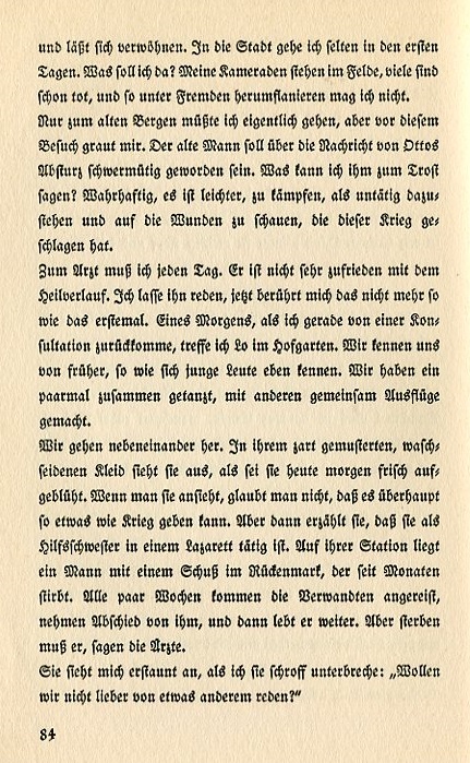 I seldom go into the city during the first days. What would I do there? My comrades are in the field, many already dead. I don't want to hang around with strangers. I had to go visit old Bergen but I'm terrified about this trip. The old man is sad about the report of Otto's crash. What can I say to comfort him? Truthfully, it's easier to fight than to stand by idly and look at the wounds that this war has inflicted. I have to go to the doctor every day. He is not very happy with my convalesence. I listen to him talk but he not longer affects me like he did before. One morning when I have just returned from the consulting room I meet Lo in the courtyard. We know each other from earlier days such as young people know one another. We danced together a couple times when we had gone on excursions with other people. We approach each other. In her pale print washable silk dress she looks as though she just bloomed fresh this morning. When one looks at her one doesn't believe there's such a thing as war. But then she says that she is working as a nursing assistant in a hospital. At her station there was a man who was shot in the spinal cord and after a few months he died. Every couple weeks relatives would travel to see him and then take their leave but he continued to live. But he had to die, the doctors said. She looks at me astonished when I abruptly interrupt her: "Wouldn't we rather talk about something else?" |
