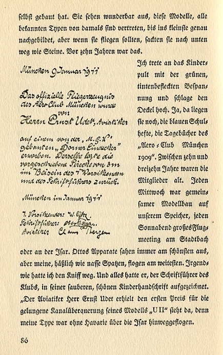 These models look great. All known planes of that time are represented, built to include the smallest detail but if they were flown they'd drop like a stone. That was ten years ago. I go to the child's desk with the green ink-speckled cover and raise the lid. Yes, it's still there, the blue school notebook, the diary of the "Aero Club, Munich, 1909." Its members were between ten and thirteen years old. Each Wednesday group model building was marked on the calendar. Each Saturday general flight meeting at the Stadtbach or on the Isar. Otto's planes always looked the best but mine, which were as ugly as wet sparrows, flew the farthest. Somehow I just had the knack. And as secretary of the club, he wrote down everything in his clean, beautiful, child's handwriting. "Aviator Ernst Udet gets first prize for successfully crossing the canal with his Model 'U II'. Let it be known my model flew away over the Isar without sustaining sea damage." _____ Hand-written note on left-hand side of page reads: Munich, January 9, 1911 The official aviator's certificate