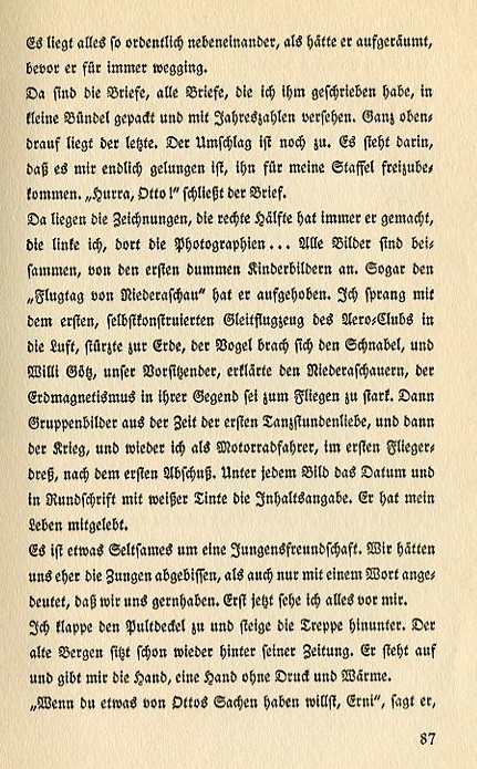 Everything laid out so neatly next to each other as though he had arranged them before he went away forever. There are the letters, all the letters I wrote to him packaged in a small bundle provided with dates. The last one lies on top. The envelop is also there. In the letter it states that I finally succeeded in having him assigned to my squadron. "Hurrah, Otto!" closed the letter. There lie the sketches. He did the right half and I did the left. There the photographs...All the pictures are there, from the first silly childhood pictures on. He hung up the "Flight Day of Niederaschau." I launched the first self-built glider of the Aero Club, crashed it to the ground with the bird breaking its beak. Willi Götz, our chairman, explained to the people of Niederaschau that the magnetic field in their area might have been too strong for flight. Then group photographs from the time of our first loves in the dance class, and then the war, then again me as a motorcycle driver, then in my first flight gear after the first plane I shot down. Under each picture the date and in a rounded hand with white ink the details. He lived my life with me. There's something strange about young friendships. We would have sooner bitten our tongues than utter a word about how happy we were to have each other. Now I see it all before me. I close the desk lid and climb back down the stairs. Old Bergen sits again behind his newspaper. He gets up and gives me his hand, a hand without strength or warmth. "If you'd like to have something of Otto's, Erni," he says. |