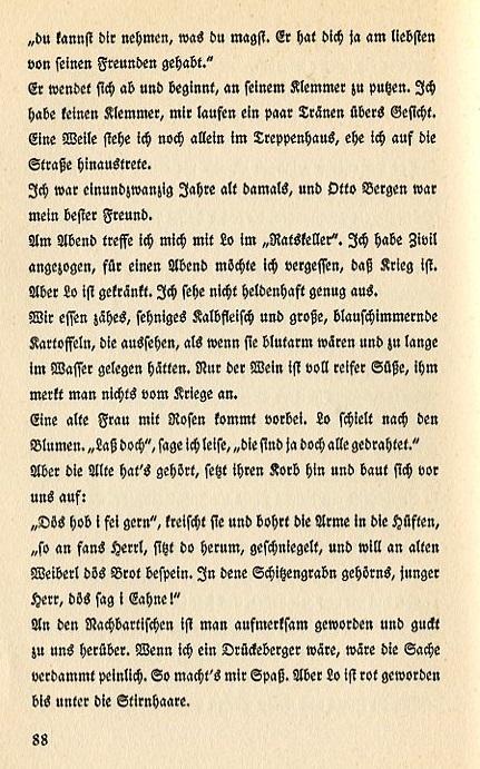 He turns and begins to clean his glasses. I have no glasses and a couple tears roll down my face. I stand for a few minutes alone in the stairwell before I go out to the street. I was twenty-one years old at the time and Otto Bergen was my best friend. That evening I go with Lo to the Ratskeller. I'm in civilian clothes. For the evening I'd like to forget there's a war. But Lo is angry. I don't look heroic enough. We eat tough, sinewy veal and large blue-tinged potatoes which look as if they are anemic and left too long in the water. Only the wine is full of mature sweetness which one never notices in wartime. An old woman with roses comes by. Lo ogles the flowers. "Leave them," I say quietly. "They're already wilting." However the old woman hears this. She sets down her basket and comes over to us. 'I heard that," she complains and plants here arms on her hips. "Such a fine gentleman, sitting there all dressed up and wanting to deny an old woman here daily bread. You belong in the trenches, young man. That's what I say to you!" They hear it at the next table and look over at us. If I had been a draft dodger that statement would have been damned embarassing. So I take it as a joke. But Lo blushes right up to her hairline. |