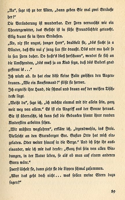 "No harm done, young man," she jabbers. "Even a blind man can see that you're far too young for that. Sometimes people just speak in anger. All you have to do is look around." She turns to the people sitting around us. "You've gotta keep an eye on children just to make sure boys are properly taught..." I wave her off. Lo has an angry crease between her eyebrows. "Like a confirmation candidate!" she blurts out. I take her hand, which lies small and brown on the white tablecloth. "Do you know," I say, "I'd like to be alone with you for a while, far away from everyone." It's a request out of the blue. She's surprised. I can almost see the thoughts running around behind her round, childlike forehead. "We'd have to get far away," she declares, "somewhere in the country. Perhaps at Starnberger Lake. Gustav Otto invited me. Or farther off into the mountains." I tell with her what I think of that. "To be completely free of all entanglements, to live with nature as if one were on another star." First she smiles, then she purses her lips. "But that's not going to happen...What would my parents say?" |