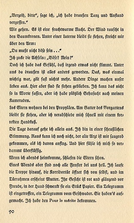 "Forgive me, please," I say. "I've gone too far." We leave. It's a warm, humid night. The wind rustles the treetops. Under a lamp post she remains standing and pats my upper arm. "You must not be angry..." I shrug my shoulders. "Angry? No!" Yet I have the feeling that something's not right. Around us everything has shifted. What was important a little while ago is no longer so. Other factors determine our lives. But here they are static. I can't put it into words but I suddenly yearn for my comrades. Lo's parents live near the Propyläen. They stand at the gate of the foremost garden but I quickly take my leave with a proper kiss of her hand. The next day I go out alone. I'm in a rotten mood. I still can't go up. The old doctor is rude to me when I start to mention it. I feel so damned useless. When I go back home my parents are already asleep. But one evening all the windows are still lit up. I run up the steps, the hall dorway opens up by itself and mother appears at the threshold. Her face is red and beaming with joy. She waves a piece of paper in her hand. A telegram has arrived, a telegram from the squadron. They opened it. I have received the "Pour le mérite." |