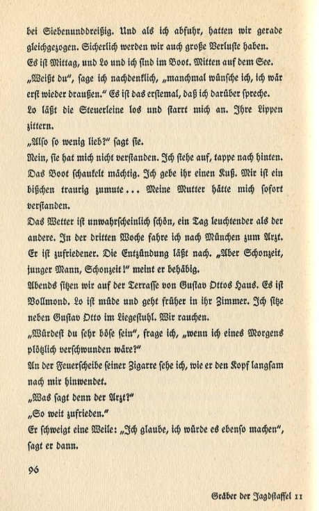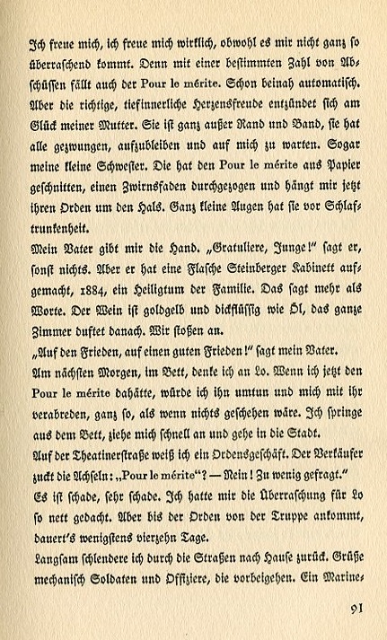 I'm happy, really happy even though it doesn't quite come as a surprise. With a certain number of planes shot down one gets the Pour le mérite. Practically authomatically. But the proper, deep and heartfelt joy burns within my mother. She's so far beyond herself she forced everyone to stay up and wait for me. Even my little sister. She cut a Pour le mérite out of paper, hung it on string, and now she places the award around my neck. Her tiny eyes are half shut in sleep. My father shakes my hand. "Congratulations, boy!" he says. Nothing else. But he's opened a bottle of Steinberger Kabinett, 1884 vintage, a sacred object in this family. That says more than words. The wine is golden yellow and thick as oil. The entire room wafts with its scent. We touch glasses. "To peace, to a good peace!" my father says. Next morning in bed I think of Lo. If I had my Pour le mérite award right now I'd put it on then go and talk to her and pretend nothing has happened. I jump out of bed, quickly dress and go into the city. On Theatiner Street I know there's a medal dealer. The merchant shrugs. "Pour le mérite?—No! Not asked for often enough." That's a shame, a real shame. I had thought a lot about surprising Lo. But it will be at least fourteen days before the medal comes from the brigade. Slowly I stroll through the streets back to home. I mechancally greet soldiers and officers who pass by. One marine officer, |