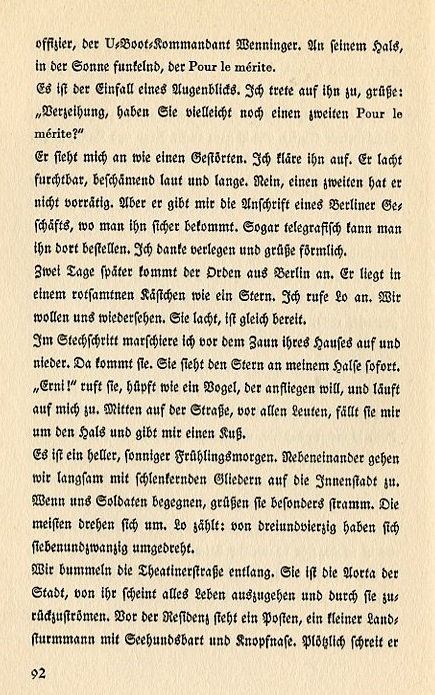 U-boat commander Wenninger, has the Pour le mérite at his neck. It shines in the sun. It's a spur of the moment idea. I explain it to him. He smiles tensely. He's obviously embarassed. No, he doesn't have a second one, but he gives me the address of a Berlin dealer where one can get one. One can order the medal via telegraph. Awkwardly I thank him and salute. Two days later the medal comes from Berlin. It rests in a red velvet box and looks like a star. I call on Lo. We want to see each other again. She smiles and she's ready to leave. I goose-step back and forth in front of the fence to her house. She comes out. She immediately sees the star at my neck. "Erni!" she calls, skipping like a bird about to take flight and runs to me. In the middle of the street, in front of everybody, she puts her arms around my neck and kisses me. It is a bright, sunny spring morning. We slowly stroll arm in arm down to the inner city. When soldiers meet us their greeting are especially robust. Most of them turn around. Lo counts. Twenty-seven of forty-three turned around. We saunter down Theatiner Street. It is the main artery of the city. All life seems to spring forth from it and cycle back through it. Before the royal palace there's a sentry post and a tiny reservist guard with a harbor seal beard and a button nose. Suddenly he shouts |
