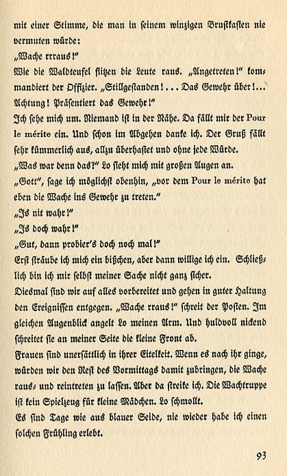 Like forest butterflies people flit around. "Come to Attention!" the officer commands. "Atten hut!...Shoulder hut!...Present Arms!" I look around. No one is in the vicinity. I hadn't considered my medal. I think of it as I leave. The salute was pretty miserable, all too rushed and without real value. "What was that all about?" Lo looks at me with large eyes. "Good God," I say as we get by. "Before the Pour le mérite medal even the guard must present his weapon." "That can't be true!" "Oh, it's true!" "Good. Let's try it out somemore!" I bristle at this for a while and then I willingly go along. Ultimately I'm not quite sure myself. This time we're prepared for anything and we encounter it with composure. "Atten hut!" shouts the sentry. At the same moment Lo sets my arm at an angle. As she walks at my side she benignly nods. Women are insatiable in their vanity. If it were up to her we would spend the rest of the morning going back and forth to the senty. But I refuse to do it. Sentry troops are not toys for little girls. Lo sulks. These are days as special as blue silk and I have never again experienced such a spring. |