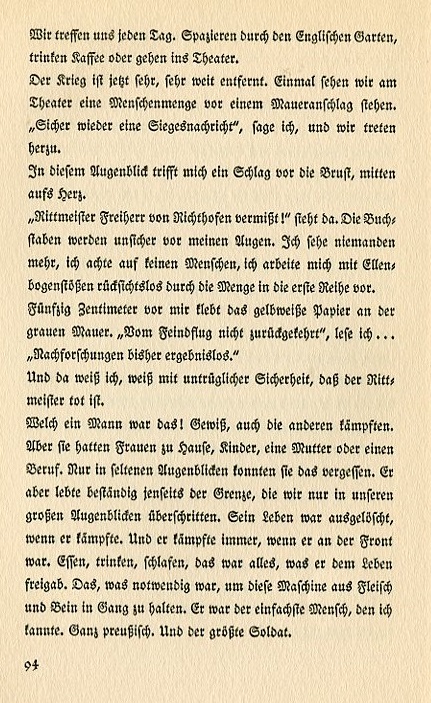 We meet every day, walk through the English garden, drink coffee, or go to the theater. The war is very, very far away. Once at the theater we see a group of people standing in front of a poster. "Certainly another report of victory," I say and we go up to it. At this moment there's a blow to my chest right in the middle of my heart. Cavalry Captain Baron von Richthofen is missing!" it states. The lettering blurs before my eyes. I see no one, I pay heed to no one, I ruthlessly elbow my way to the head of the crowd. Fifty centimeters in front of me hangs the yellow-white paper on the gray wall. "Not Brought Down by Enemy Plane," I read..."To Date Investigation Yields No Information." And then I know, know with unmistakable certainty, that the Cavalry Captain is dead. What a man he was! It's certain too that others also fought. But they had wives at home, children, mothers or careers. Only during rare moments could they forget all that. However he lived right there at the edge to which we only crossed over at intense moments. He forgot his life when he fought. And he always fought whenever he was at the front. Eatting, drinking, sleeping; that was all he allowed himself in life, and only when it was necessary to maintain this physical mechanism. He was the simplest man that I knew. Entirely Prussian, and the ultimate soldier. |