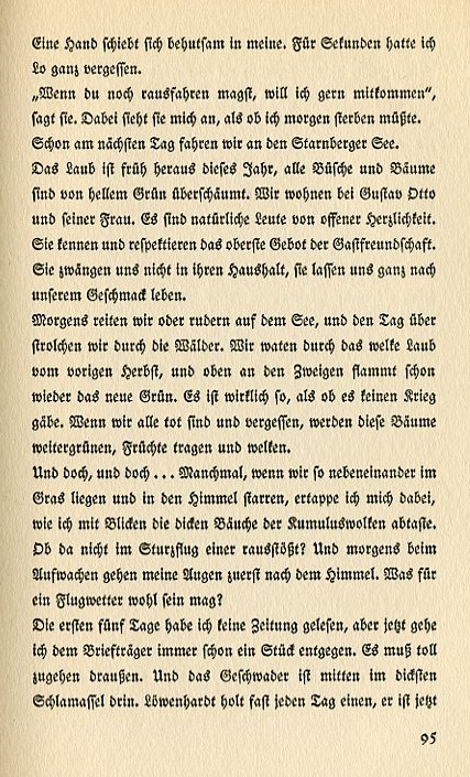 A hand carefully places itself in mine. For a few moments I had completely forgotten Lo. "If you'd like to drive out to the county I'll gladly go with you," she says. She looks at me as thought I'm going to die tomorrow. The next day we drive to Starnberger Lake. The foliage is out early this year. All the bushes and trees are covered in bright green. We stay by Gustav Otto and his wife. They are honest people of generous nature. They acknowledge and respect the highest rules of hospitality. They do not force us to remain at their home. Rather they leave us to do as we see fit. In the morning we horseback ride or sail on the lake and later in the day we stroll through the woods. We wade through the fallen leaves of the previous fall as above us the branches burst forth with new greenery. It's as if there is no war. When we are all dead and forgotten these trees will sprout anew, bear fruit and drop their leaves. And yet...and yet...sometimes when we lie so close to each other in the grass and stare up into the sky, I catch myself picturing the plump bellies of the cumulus clouds. Almost as if I'm diving to attack? In the morning when I get up the first thing I do is look up at the sky. What kind of flying weather would I have today? The first five days I read no newspapers but now I go to the postman every day for a paper. It must be getting crazy out there. And the squadron is in the middle of the thickest action. Löwenhardt gets one almost every day. Now he's up to thirty-seven.