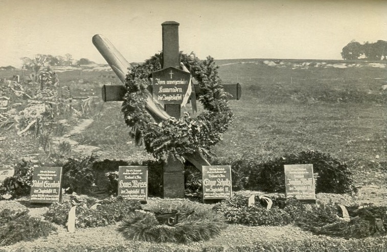 Caption at the bottom of page 96: The graves of Fighter Squadron 11 - Robert Gisbert, Hans Weiss, Edgar Scholtz, Joachim Wolff |
