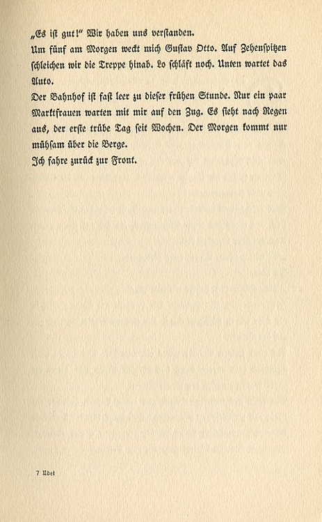 "It's good!" We understood each other. Gustav Otto wakes me up at five in the morning. We tiptoe down the steps. Lo's still asleep. The car awaits us below. The train station is almost empty at this early hour. Only a pair of market women wait with me for the train. It looks like rain, the first dismal day in weeks. The morning sun climbs with effort over the mountains. I ride back to the front. |