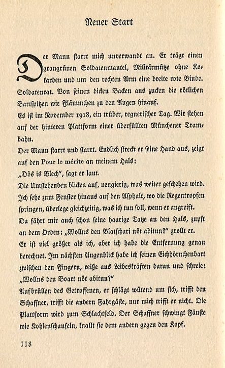 The man stares fixedly at me. He's wearing a gray-green soldier's coat, military cap without insignia and a broad red band on his right arm. Soldier's council. Protruding from his plump cheeks right up to his eyes are the points of his red mustache flickering like little flames. It is November 1918, a dreary and rainy day. We stand on the rear platform of an overfilled Munich tram. The man stares and stares. Finally he sticks out his hand and points to the Pour le mérite around my neck: "That's tin," he says aloud. The bystanders look about curiously, wondering what's happening. I look out the window at the asphalt where the raindrops bounce around and consider what I'll do if he grabs it. He already has his hairy paw on my neck flicking the medal. "Don't you want to get rid of that big strange shaped thing?" he growls. He's much bigger than I am but I've calculated the distance. In the next second I have his squirrelly beard between my fingers and I yank it and shout, "Don't you want to get rid of that beard?" The crowd bellows. In rage he throws some punches, hits the conductor, hits a few passengers but misses me. The platform becomes a battlefield. The conductor swings his fists like coal shovels which connect with his opponents head. |
