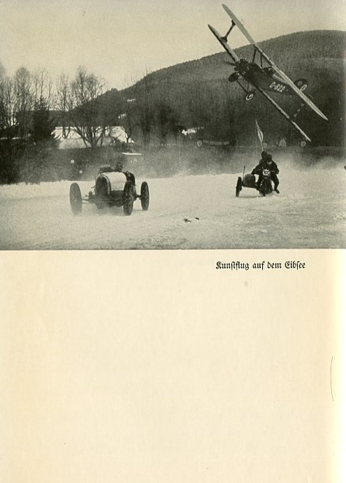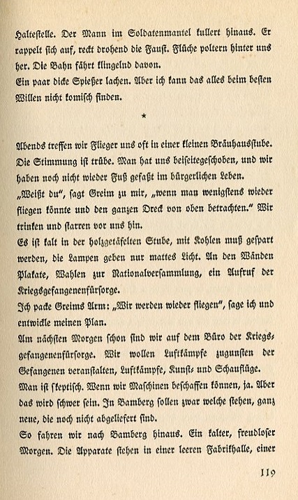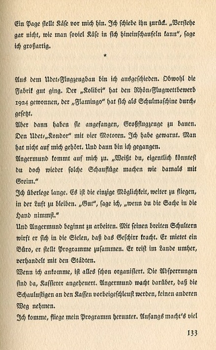 A hotel employee places cheese before me. I push it back. "I don't understand how anyone can shovel in so much cheese," I state grandly. I've retired from the Udet Airplane Facotory even though the operation is going well. The "Kolobri" has won the 1924 Rhone Flight Competition. The "Flamingo" has been instituted as a flight instruction plane. Since then they've started building large airplanes. The Udet "Kondor" has four engines. I gave them warning but they didn't listen. I left. Angermund comes up to me. "You know, maybe you could put on another airshow like the one you did with Greim." I contempate this for a while. It's the only way to continue flying, to stay in the air. "Okay," I say. "If you take care of the details." And Angermund begins to work. He sets his broad shoulders to the task of clearing the way. He rents an office and puts together a program. He travels around the country and negotiates with the municipalities. When I arrive everything is already organized. The barriers are set up and the cashiers hired. Angermund watches to make sure onlookers don't get past the box office. There's no other way in. I come and perform my stunts. At first it's |