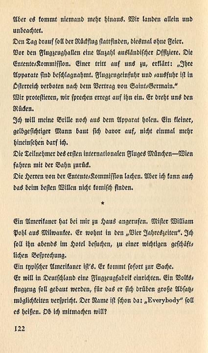 But nobody comes out. We land alone and unnoticed. The return trip is supposed to happen a day later, this time without ceremony. Before the airplane hangar there's a number of foreign officials. The Entente Commission. One of them comes up to us and declares, "Your planes are confiscated. Airplane travel in and out of Austria is forbidden according to the Treaty of Saint Germain." We protest, we speak excitedly to him. He turns his back on us. I want to get my goggles from the plane. A small, jaundice faced man moves in front of the plane. I may not peer inside it even once. The participants of the first international flight from Munich to Vienna return home by train. The gentlemen of the Entente Commission laugh, but as best as I can determine, there's nothing funny about it. An American calls me at my house. Mister William Pohl of Milwaukee. He's staying at the "Four Seasons." I'm to visit him tonight at his hotel in order to discuss an important business proposal. He's a typical American. He comes right to the point. He wants to build an airplane factory in Germany. It will manufacture aircraft for civilian transport. He believes it holds great promise for sales. The name is already established: "Everybody" it shall be called. Do I want to take part in this venture? |
