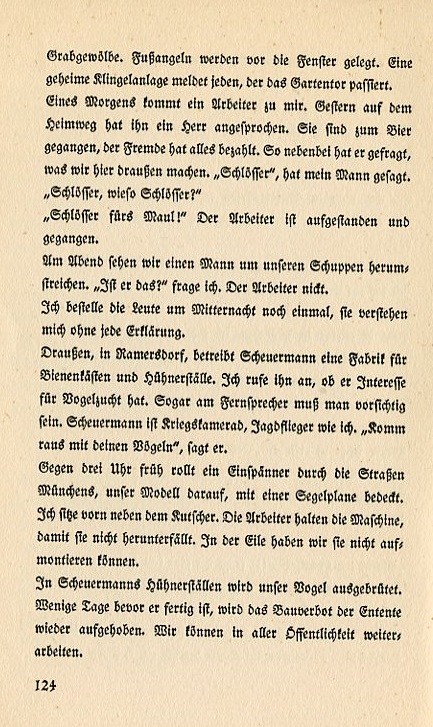 Caltrops are placed before the window. A secret bell system alerts us to anyone passing through the garden gate. One morning a worker comes to me. Yesterday on the way home he spoke with a man. They went to get some beer. The stranger paid for everything. During all this the man asked what we were making here. "Locks," my man says. "Locks, what kind of locks?" "Locks for the mouth!" The worker stood up and left. In the evening we see a man strolling around the shed. "Is that him?" I ask. The worker nods. Around midnight I summon the men again. They need no explanation. Over in Ramersdorf Scheuermann operates a factory for bee hives and chicken coops. I call him up and ask him if he's interested in bird breeding. Even on the telephone one must be careful. Scheuermann is a war comrade, a fighter pilot like me. "Come over with your birds," he says. At three in the morning a one-horse carriage rolls through the streets of Munich. Our model, a seaplane is on it. I sit up front near the coach driver. The workers hold down the machine so it won't fall off. In our haste we didn't have time to strap it down. Our bird will hatch in Scheuermann's chicken coop. A few days before it's finished the Entente Commission's building ban is lifted. We can work again in the open. |