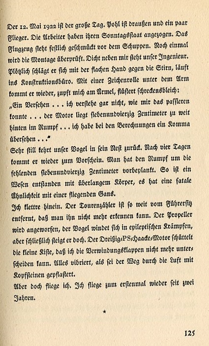 May 12, 1922 is the big day. Pohl is outside with a couple pilots.The workmen have put on their Sunday best. The airplane stands festively decorated before the shed. Once again the assembly is inspected. Our engineer stands close to me. Suddenly he hits his forehead with the palm of his hand and runs to the construction office. He comes back out with the rolled up specifications under his arm. Flustered and deathly pale, he grabs my arm: "A mistake...I don't understand how this could have happened to me..the engine sits forty-seven centimeters too far behind in the fuselage...during the calculation I overlooked a decimal point..." Very quietly we return our bird to its nest. Four days later he comes back out in the open. They added the needed forty-seven centimeters onto the fuselage. And thus a new being came into existence with an overly long body which had a fateful resemblance to a flying goose. I climb in. The tachometer is so far from the pilot's seat that you can't read it anymore. The propeller is pitched, the bird turns in epiletic spasms, however eventually it rises. The thirty horsepower Haake engine shakes the cockpit so much that the stabilizers have no effect. Everything vibrated as if the path through the air was paved with cobblestones. And yet I fly. I fly for the first time in two years. |