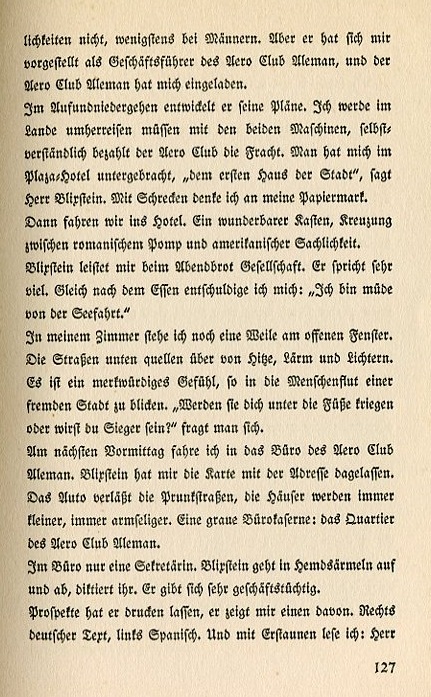 especially among men. But he introduced himself as the business manager of the Aero Club Aleman, and the Aero Club Aleman did invite me. While going up and down the deck he formulates his planes. I'll travel around the county with the two planes with the Aero Club naturally picking up the freight costs. They put me up inthe Plaza Hotel, "the premier house in the city," Mr. Blixstein explains. In horror I think of my German currency. Them we drive to the hotel. A showcase cross between Romance pomp and American objectivity. Blixstein keeps me company during dinnter. He talks a lot. As soon as the meal is over I excuse myself. "I'm tired from the sea journey." In my room I stand a while before the open window. The streets below are steeped in heat, noise, and lights. It's a strange feeling observing the mass of humanity in a foreign city. "Will you be trodden underfoot or will you be a victor?" you ask yourself. The next morning I drive to the office of the Aero Club Aleman. Blixstein left the the card with the address. The car leaves the elegrant streets, the houses get smaller and more humble. A gray office barracks: Headquarters for the Aero Club Aleman. There's only one secretary in the office. Blixstein goes about in shirtsleeves giving her dictation. He seems quite businessman. He had prospectuses printed up. He shows me one of them. German on the right hand side, Spanish on the left. In astonishment I read: |