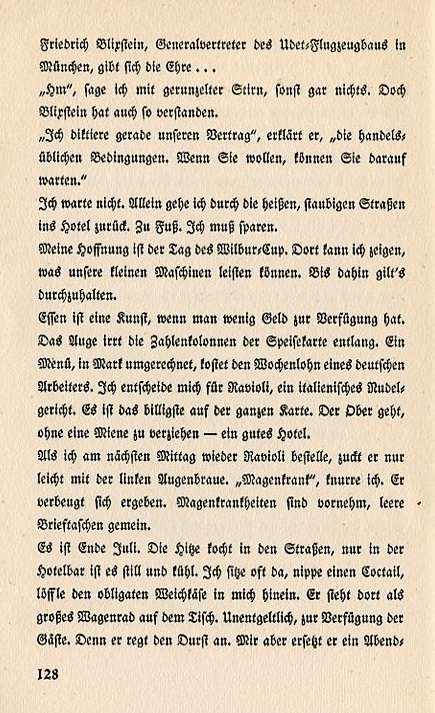 Mr. Friedrich Blixstein, chief representative for the Udet airplane Factory in Munich, has the honor... "Hm," I say with wrinkled brow, nothing else. But Blixstein understood. "I just dictated our contract," he clarifies, "the usual business stipulations. If you wish, you can wait for it." I don't wait. Alone I go back through the hot, dusty streets to the hotel. On foot. I must save money. My hope lies in the day of the Wilbur Cup. There I can demonstrate what our little planes can do. Until then it's best to stay put. Eating is an artform when one has little money to spare. The eyes stay for a long time on the price column of the menus. One meal price converted into German Marks, costs the weekly wage of a laborer. I decide on ravioli, an Italian noodle dish. It's the cheapest thing on the menu. The waiter leaves without changing his expression—a good hotel. When I order ravioli agin the next day he only slightly raises his eyebrow. "Stomach disorder," I grumble. He bows slightly. Aristocrats have stomach disorders; commoners have empty wallets. It's the end of July. Heat bakes the streets but it's quiet and cool in the hotel bar. I often sit there sipping a cocktail and spooning the customary soft cheese into myself. I stays at the table like a giant wagon wheel. It's complementary, placed there for the guests. It makes you thirsty. However I have it instead of dinner bread. |