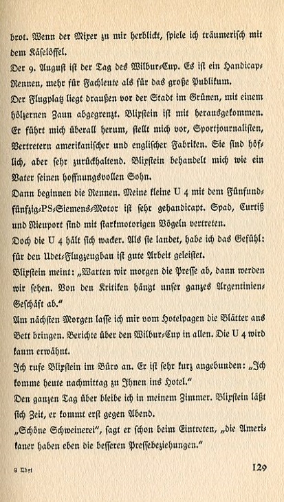 When the bartender looks at me I dreamily play with the cheese spoon. August 9th is the day of the Wilbur Cup. It is a handicap race, more for the initiated than for the public at large. The airport lies outside the city in a pasture bordered by a wooden fence. Blixstein has come out there. He drives me everywhere and introduces me to sports journalists and representatives of American and English manufacturers. They are courteous but very reserved. Blixstein treats me like the father of a son with a promising future. Then the races begin. My little U4 with the fifty-five horse power Siemens engine is severely handicapped. Spad, Curtiss and Nieuport are represented with strong-motored birds. But the U4 valiently holds its own. As it lands I have the feeling: The Udet Airplane Factory has produced good work. Blixstein reckons, "Wait until the news reports tomorrow, then we'll see. Our entire Argentinian enterprise depends upon the critics." The next morning I have the hotel page bring me the newspapers in bed. Reports about the Wilbur Cup in all of them. The U4 is barely mentioned. I call Blixstein at his office. He's very abrupt. "I'll come this afternoon to your hotel." I wait the entire day in my room. Blixstein takes his time and doesn't arrive until the evening. "What a mess," he says as he enters. "The Americans have the best press relationships." |