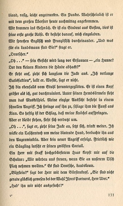 He's blond, rosy cheeked, and slightly drunk. A Yankee. He probably arrived this afternoon on the large ocean liner. We start talking. He's a student from Boston and this is his first long journey. He insists on buying me a drink. We speak English and French throughout. "And what is your nationality?" he asks. "German." "Oh..." his face drops in astonishment. "A Hun? Who lops off little children's hands?" He stands up and slowly takes off his jacket. "I demand satisfaction," he slurs. He doesn't say what for. I've just jumped down off the barstool. He's a head taller than me and in good shape. You can see muscle movement under his shirtsleeve. My only chance is a quick attack. I jump on him and pound his chin with my fist. It's such a heavy blow that I crack my knuckles. He remains standing but looks around perplexed. "Oh..." he says, puts his jacket back on, sits down and drinks some more. I wrap a handkerchief around my bloody hand and look at him from the corner of my eye. No further assault ensues. Happy as a baby he swills down his twelfth cocktail. A gentleman with stiffly brushed-up hair taps me on the shoulder. "We'd be very happy if you'd join us at our table." He's German, a countryman. "Blixstein?" says the man with the bushy hair. "You are not quite pleased with your choice in partners, Mr. Udet." "I didn't go out looking for him!" |