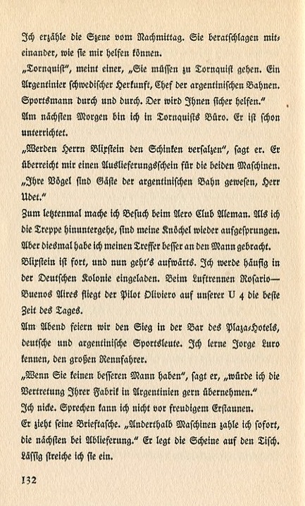 The Aero Club Aleman in Buenos Aires has invited me to a flight meet. It's about the Wilbur Cup. We talked about it a long time. Pohl is against it. Scheuermann, now our technology head, is for it. The Udet Airplane Factory has grown significantly since its origins a year ago. The childhood illness of the first enterprise has been overcome. We have produced model types U2 and U4 and they've sold well. But a trip over to South America is costly, especially in German money, and we're in the middle of an inflationary period. I finally decide to go. The possibility of conducting business internationally is too appealing to ignore. In Buenos Aires Mr. Friedrich Blixstein comes on board. The ship has anchored at the pier. It's evening and the bay is filled with blue shadows. The first lights are igniting in the city. On deck Blixstein runs with open arms towards me and grasps both my hands: "My dear Mr. Udet, you're here; you're really here!" Tiny beads of sweat glisten on his brow. "Well you invited me..." My reserve in no way dampens his enthusiasm. "Would you like to see how I have prepared for your arrival?" He takes a bundle of newspapers out of his coat pocket and unfolds them with nervous fingers. "The Ace of Aces" is there with my photograph. I csn't read the rest of the Spanish. We stroll back and forth on the promenade deck. Blixstein has grabbed me and linked our arms. I don't like such familiarity, |