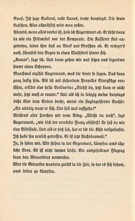 great fun; hunting down balloons, rolling turns and looping. The crowd claps but then it gets bored. In the evening, when everything is over, I call to Angermund. He stands there like a field sergeant before the company. The cashiers enter and deposit their bundles of paper money and coins. He counts up the bounty and shoves it into a laundy basket he keeps behind himself. "Come," I say. And we go and sit somewhere with a pint or two. Sometimes Angermund relates what the people had to say. That can be quite amusing. When I performed a dive with stalled propeller one bright woman from Berlin declared, "Look, he can't do anything else but come down." And when I did my loop-the-loops close to the ground in Leipzig a flight enthusiast from Saxony said, "He gets so low, he's gonna kill himself!" But most of the time we talk about the war. "Do you still remember," Angermund says, "how that crazy Frenchman shot you down? He sat there like a statue. And when he saw you he completely hacked all over your crate. I saw him a while back. He's a lawyer now." And so we live on. We stand in the present and fight for our daily bread. It's not always easy. A failed day of flying can upset a month's work. But the mind keeps going back to the days in which you had to fight just to stay alive. |