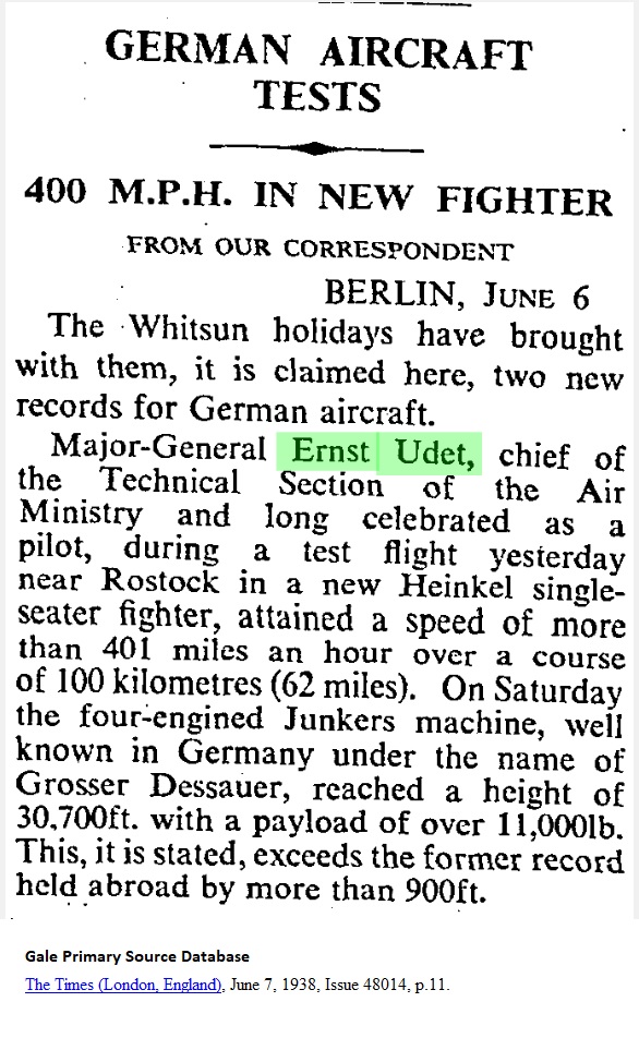 The Times (London, England), June 7. 1938, p.11 TESTS _____ 400 M.P.H. IN NEW FIGHTER FROM OUR CORRESPONENT Berlin, June 6 The Whitsun holidays have brought with them, it is claimed here, two new records for German aircraft. Major-General Ernst Udet, chief of the Technical Section of the Air Ministry and long celebrated as a pilot, during a test flight yesterday near Rostock in a new Heinkel single-seater fighter, attained a speed of more than 401 miles an hour over a course of 100 kilometres (62 miles). On Saturday the four-engined Junkers machine, well known in Germany under the name of Grosser Dessauer, reached a height of 30,700 ft. with a payload of over 11,000 lb. This, it is stated, exceeds the former record held abroad by more than 900 ft. |