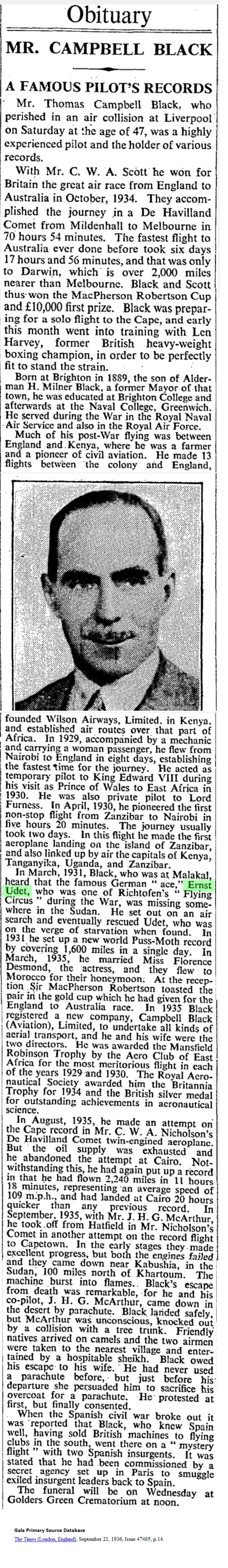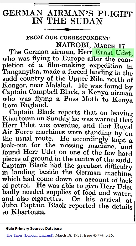 The Times (London, England), March 18, 1931, p.15 IN THE SUDAN _____ FROM OUR CORRESPONDENT Nairobi, March 17 The German airman, Herr Ernst Udet, who was flying to Europe after the completion of a film-making expedition in Tanganyika, made a forced landing in the sudd country of the Upper Nile, north of Kongor, near Malakal. He was found by Captain Campbell Black, a Kenya airman who was flying a Puss Moth to Kenya from England. Captain Black reports that on leaving Khartoum on Sunday he was warned that Herr Udet was overdue, and that Royal Air Force machines were standing by on the usual route. He accordingly kept a look-out for the missing machine, and found Herr Udet on one of the few hard pieces of ground in the center of the sudd. Captain Black had the greatest difficulty in landing beside the German machine, which had come down on account of lack of petrol. He was able to give Herr Udet badly needed supplies of food and water, and also cigarettes. On his arrival at Juba Captain Black reported the details to Khartoum. |