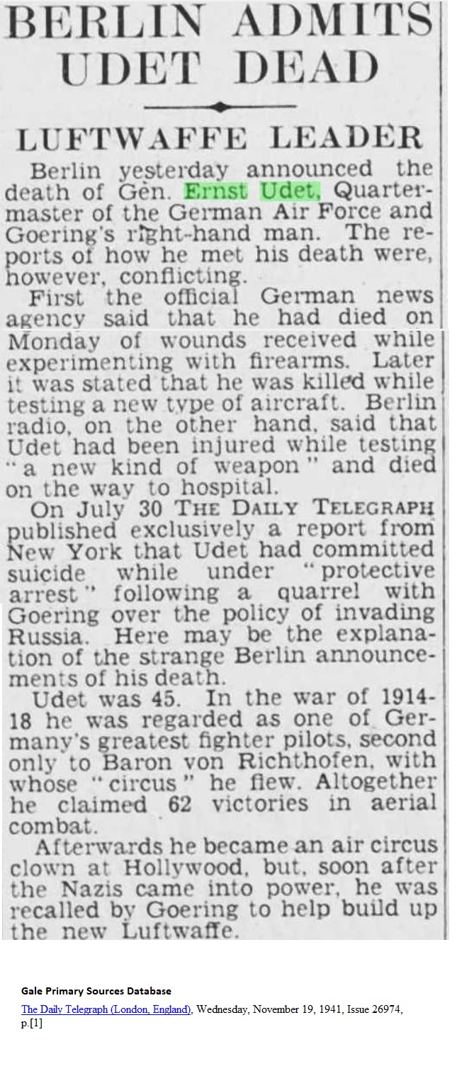 The Daily Telegraph (London, England), Wednesday, November 19, 1941, p.[1] UDET DEAD _____ LUFTWAFFE LEADER Berlin yesterday announced the death of Gen. Ernst Udet, Quartermaster of the German Air Force and Goering's right-hand man. The reports of how he met his death were, however, conflicting. First the official German news agency said that he had died on Monday of wounds received while experimenting with firearms. Later it stated that he was killed while testing a new type of aircraft. Berlin radio, on the other hand, said that Udet had been injured while testing "a new kind of weapon" and died on the way to the hospital. On July 30 The Daily Telegraph published exclusively a report from New York that Udet had committed suicide while under "protective arrest" following a quarrel with Goering over the policy of invading Russia. Here may be the explanation of the strange Berlin announcement of his death. Udet was 45. In the war of 1914-18 he was regarded as one of Germany's greatest fighter pilots, second only to Baron von Richthofen, with whose "circus" he flew. Altogether he claimed 62 victories in aerial combat. Afterwards he became an air circus clown at Hollywood, but soon after the Nazis came into power, he was recalled by Goering to help build up the new Luftwaffe. |