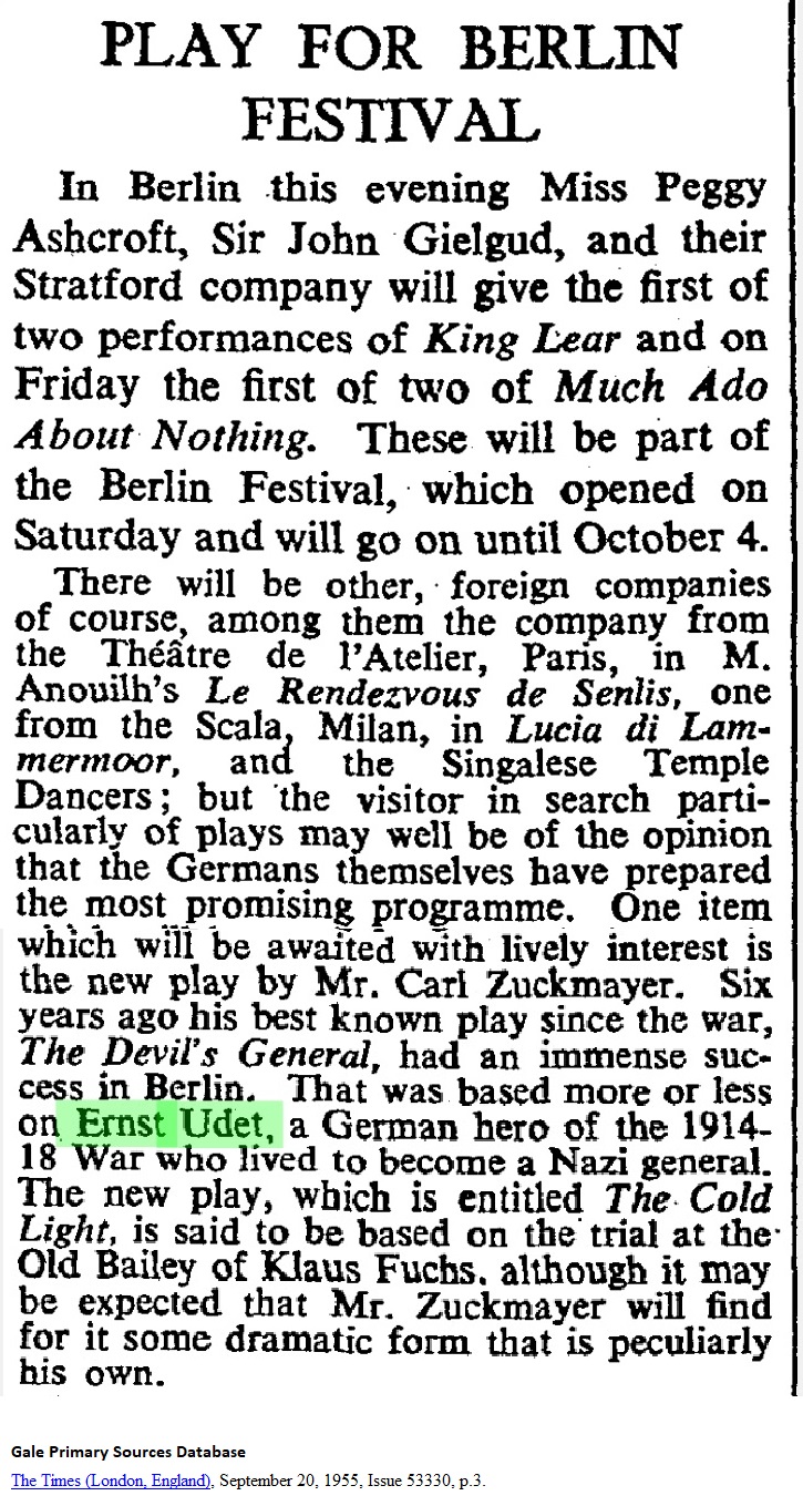 The Times (London, England), September 20, 1955, p.3 FESTIVAL In Berlin this evening Miss Peggy Ashcroft, Sir John Gielgud, and their Stratford company will give the first of two performances of King Lear and on Friday the first of two of Much Ado About Nothing. These will be part of the Berlin Festival, which opened on Saturday and will go on until October 4. There will be other, foreign companies of course, among them the company from the Théâtre de l'Atelier, Paris, in M. Anouilh's Les Rendezvous de Senlis, one from the Scala, Milan, in Lucia di Lammermoor, and the Singalese Temple Dancers; but the visitor in search particularly of plays may well be of the opinion that the Germans themselves have prepared the most promising programme. One item which will be awaited with lively interest is the new play by Mr. Carl Zuckmayer. Six years ago his best known play since the war, The Devil's General, had an immense success in Berlin. That was based more or less on Ernst Udet, a German hero of the 1914-18 War who lived to become a Nazi general. The new play, which is entitled The Cold Light, is said to be based on the trial at the Old Bailey of Klaus Fuchs, although it may be expected that Mr. Zuckmayer will find for it some dramatic form that is particularly his own. |