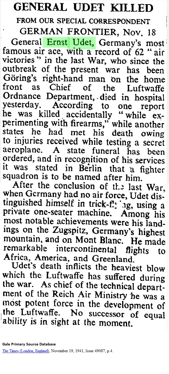 The Times (London, England), November 19, 1941, p.[4] FROM OUR SPECIAL CORRESPONDENT GERMAN FRONTIER, NOV. 18 General Ernst Udet, Germany's most famous air ace, with a record of 62 "air victories" in the last War, who since the outbreak of the present war has been Göring's right-hand man on the home front as Chief of the Luftwaffe Ordnance Department, died in hospital yesterday. According to one report he was killed accidentally "while experimenting with firearms," while another states he had met death owing to injuries received while testing a secret aeroplane. A state funeral has been ordered, and in recognition of his services it was stated in Berlin that a fighter squadron is to be named after him. After the conclusion of the last War, when Germany had no air force, Udet distinguished himself in trick-flying, using a private one-seater machine. Among his most notable achievements were his landings on the Zugspitz, Germany's highest mountain, and on Mont Blanc. He made remarkable intercontinental flights to Africa, America, and Greenland. Udet's death inflicts the heaviest blow which the Luftwaffe has suffered during the war. As chief of the technical department of the Reich Air Ministry he was a most potent force in the development of the Luftwaffe. No successor of equal ability is in sight at the moment. |