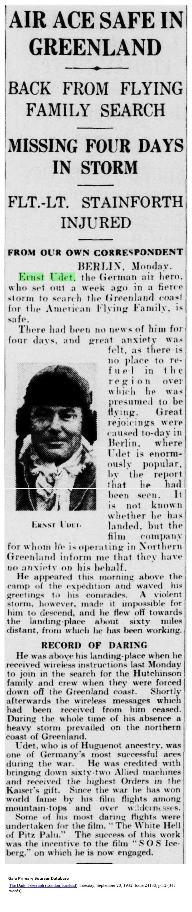 _____ From Our Own Correspondent Berlin, Monday. Ernst Udet, the German air hero, who set out a week ago in a fierce storm to search the Greenland coast for the American Flying Family, is safe. There had been no news of him for four days, and great anxiety was felt, as there is no place to refuel in the region over which he was presumed to be flying. Great rejoicings were caused to-day in Berlin, where Udet is enormously popular, by the report that he had been seen. It is not known whether he has landed, but the film company for whom he is operating in Northern Greenland informed me that they have no anxiety on his behalf. He appeared this morning above the camp of the expedition and waved to his comrades, A violent storm, however, made it impossible for him to descend, and he flew off towards the landing-place about sixty miles distant, from which he has been working. He was above his landing-place when he received wireless instructions last Monday to join in the search for the Hutchinson family and crew when they were forced down off the Greenland coast. Shortly afterwards the wireless messages which had been received from him ceased. During the whole time of his absence a heavy story prevailed on the northern coast of Greenland. Udet, who is of Huguenot ancestry, was one of Germany's most successful aces during the war. He was credited with bringing down sixty-two Allied machines and received the highest Orders in the Kaiser's gift. Since the war he has won world fame by his film flights among mountain-tops and over wildernesses. Some of his most daring flights were undertaken for the film, "The White Hell of Pitz Palu." The success of this work was the incentive to the film "SOS Iceberg," on which he is now engaged. |