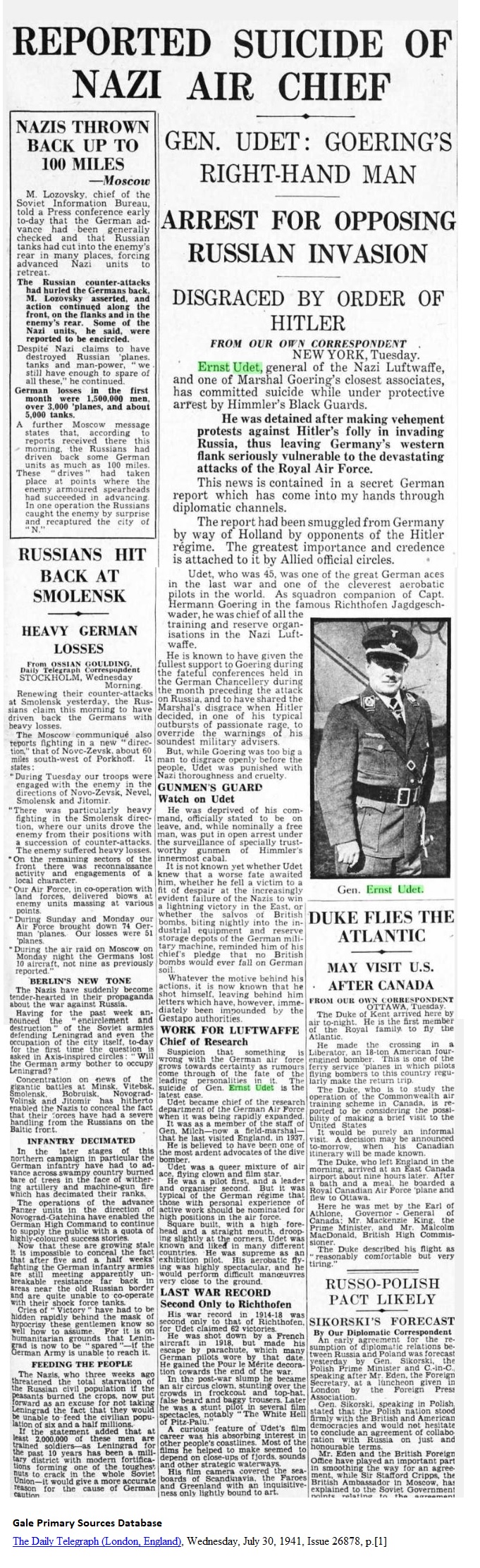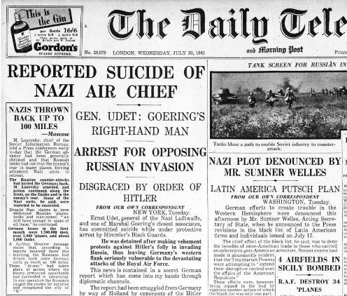 The Daily Telegraph (London, England), Wednesday, July 30, 1941, p. [1] NAZI AIR CHIEF _____ GEN. UDET: GOERING'S