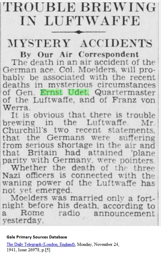 The Daily Telegraph (London, England), Monday, November 24, 1941, p.[5] IN LUFTWAFFE _____ MYSTERY ACCIDENTS By Our Air Correspondent The death in an air accident of the German ace, Col. Moelders, will probably be associated with the recent deaths in mysterious circumstances of Gen. Ernst Udet, Quartermaster of the Luftwaffe, and of Franz von Werra. It is obvious that there is trouble brewing in the Luftwaffe. Mr. Churchill's two recent statements, that the Germans were suffering from serious shortage in the air and that Britain had attained 'plane parity with Germany were pointers. Whether the death of the three Nazi officers is connected with the waning power of the Luftwaffe has not yet emerged. Moelders was married only a fortnight before his death, according to a Rome radio announcement yesterday. |