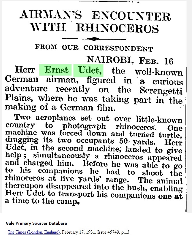The Times (London, England), February 17, 1931, p.13 WITH RHINOCEROS _____ FROM OUR CORRESPONDENT Nairobi, Feb. 16 Herr Ernst Udet, the well-known German airman, figured in a curious adventure recently on the Serengetti Plains, where he was taking part in the making of a German film. Two aeroplanes set out over little-known country to photograph rhinoceros. One machine was forced down and turned turtle, dragging its two occupants 50 yards. Herr Udet, in the second machine, landed to give help; simultaneously a rhinoceros appeared and charged him. Before he was able to go to his companions he had to shoot the rhinoceros at five yards' range. The animal thereupon disappeared into the bush, enabling Herr Udet to transport his companions one at a time to the camp. |