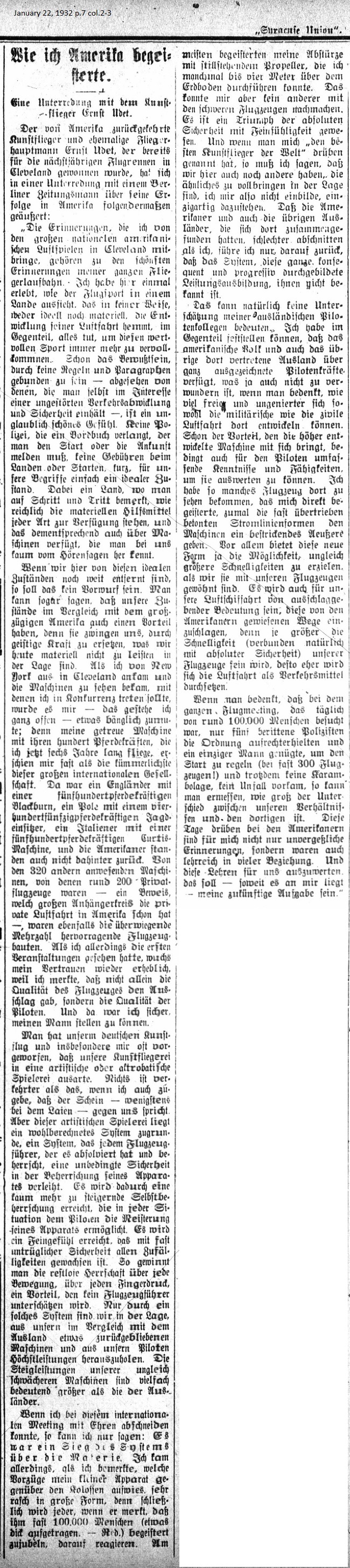 Syracuse Union January 22, 1932 page 7 _____ An Interview with Stunt Pilot Ernst Udet "The memories which I bring back from the grand national American airshow in Cleveland belong to the most beautiful moments in my flying career. I experienced how aerial sports looks in a country that in no way is either imaginary or tangible. The evolution of aviation encompasses everything in order to constantly improve it as a worthy sport. Already the awareness, not bound by any rules or stipulations except for those which one observes in the interest of undisturbed traffic control and safety, is an incredibly fine feeling. No police asking for a log book, which one must produce at the start of a flight or at the point of arrival, no fees for takeoff or landing; in brief, to my mind, the ideal situation. Add to this in a country where one notices at every turn how ample material resources of all kinds are available along with the corresponding machinery to an extent one never hears spoken about in our country. If we here are so far away from this ideal situation, it's not a reproach. One can say that our circumstances in comparison with those of lavish America also present an advantage because it forces us to compensate with the power of intellect when we're not in position to acquire the necessary materials. When I arrived in Cleveland from New York and acquired the materials with which I could enter the competition, it was somewhat daunting — I often feel that way — my trusty machine with its hundred horsepower engine, which I had been flying for six years, seemed almost puny compared to this grand international entourage. There was an Englishman with a five hundred horsepower Blackburn, a Pole with a four hundred, fifty horsepower Jagd one-seater, an Italian with a five hundred horsepower Curtis engine, and the Americans didn't lag behind. Of the 320 other machines present, around 200 were privately owned aircraft — proof of the large number of devotees of private aviation in America, the overwhelming majority of which exhibired excellent aircraft construction. When I watched the first meets my confidence grew substantially because I noticed that not only did the quality of the aircraft tip the scales but also the quality of the pilots. And then I was certain I could enter my old man. People have often suggested our German stunt flying, and mine in particular, of being artistic or acrobatic shenanigans. There's nothing more incorrect, though I do admit, to the layman it must so appear. But behind this artistic gimmickry lies a well thought-out system which every fully-schooled aviator has mastered with an unconditional confidence in the control of his apparatus. It's achieved through an ever rising level of self control which allows the pilot complete mastery of his machine under every circumstance. A level of sensitivity has been achieved which evolved with almost infallible confidence in all eventualities. One gains utter dominence over every move, over every press of the finger; an advantage no aviator will underestimate. Only through such a system are we in the position to extract maximum performance from our somewhat antiquated machinery, when compared to the rest of the world, and our pilots. The ability to climb higher in our disparately weaker machines is significantly greater than that of the foreigners. If I could depart from this international meeting with honors, I can only say, it was a victory of the system over the equipment. I noticed what advantages my little plane had over the colossal ones, the rapid speed and the great form, then noticed that everyone watching, close to 100,000 people (Laying it on a bit thick — The Editor) rapt and cheering, I reacted. Most of all they were enthralled by my landing with a feathered propeller, which I accomplished some four meters above the ground. No one else was able to do that with their heavy aircraft. It has been a triumph of absolute confidence with delicacy. When they called me "the best stunt pilot in the world" I must respond that we have a lot more of them here who are in a position to execute similar maneuvers. I don't consider myself unique. That the Americans and the other foreigners who had gathered there together received poorer instruction leads me back to the point that it's due to the system, this complete, consistent and progressive competency training of which they are unaware. That doesn't mean I underestimate my foreign aviation colleagues. To the contrary, I can declare that the American people and those represented by other countries have command of excellent piloting skills even when you consider how very freely and unabashedly military and civilian aviation has developed. Even the advantages, which these highly developed machines offer, become a valuable part of the pilots' comprehensive knowledge and ability. I have been able to see so many airplanes there which have enchanted me, especially the exaggerated streamlined forms which give the machine a charming exterior. Above all else this new form offers the possibility of acccomplishing unparallelled speed, much greater than anything to which we are accustomed. This is also of huge significance for our airline flights because the greater the speed (naturally within limits of absolute safety) of our aircraft, the more we are able to establish air travel as a means of transportation. When one considers that the daily attendance at the flight meet was around 100,000 people with only five policemen mounted on horseback and only one man was needed to arrange takeoffs (with almost 300 aircraft!) and not even a single collision or injuries occurred, one can gage how large the difference is between our circumstances and theirs. These days over with the Americans are not only unforgettable memories but packed with lessons on many levels. And it will be my future task to assess just how valuable these lessons are — to whatever extent I am able. |