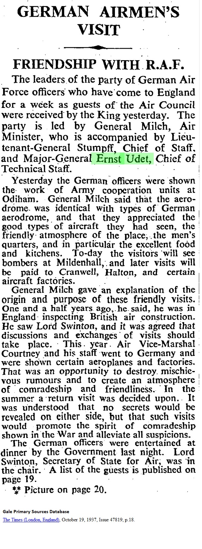 The Times (London, England), October 19, 1937, p.18 VISIT _____ FRIENDSHIP WITH R.A.F. Yesterday the German officers were shown the work of Army cooperation units at Odiham. General Milch said that the aerodrome was identical with types of German aerodrome, and that they appreciated the good types of aircraft they had seen, the friendly atmosphere of the place, the men's quarters, and in particular the excellent food and kitchens. To-day the visitors will see bombers at Mildenhall, and later visits will be paid to Cranwell Halton, and certain aircraft factories. General Milch gave an explanation of the origin and purpose of these friendly visits. One and a half years ago, he said, he was in England inspecting British air construction. He saw Lord Swinton, and it was agreed that discussions and exchanges of visits should take place. This year Air Vice-Marshal Courtney and his staff went to Germany and were shown certain aeroplanes and factories. This was an opportunity to destroy mischievous rumours and to create an atmosphere of comradeship and friendliness. In the summer a return visit was decided upon. It was understood that no secrets would be revealed on either side, but that such visits would promote the spirit of comradeship shown in the War and alleviate all suspicions. The German officers were entertained at dinner by the Government last night. Lord Swinton, Secretary of State for Air, was in the chair. A list of the guests is published on page 19. Picture on page 20 |