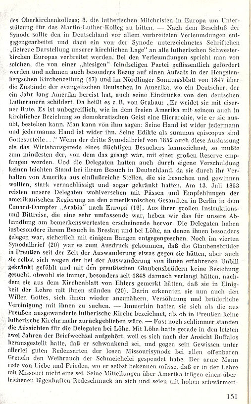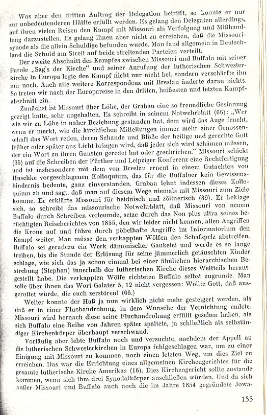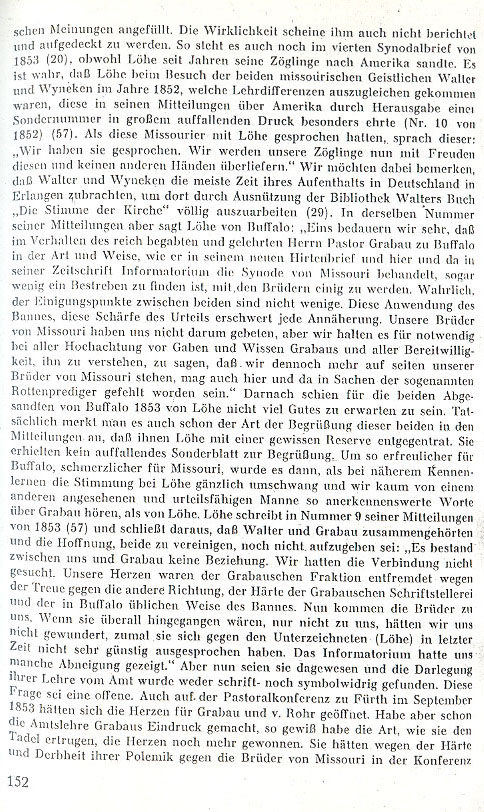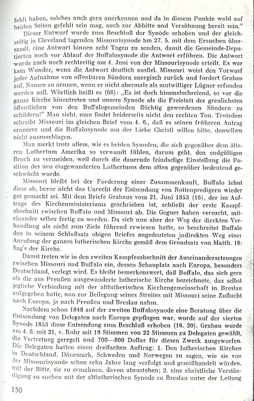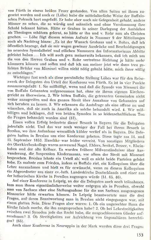 The reality of things did not seem to have been reported and disclosed. So it also stands in the fourth synodal letter of 1853 (20), although Löhe had been been sending his disciples to America for years. It is true that Löhe had discussed doctrinal differences when pastors Walter and Wynecken visited him in 1852 and this was published with large and sticking print in a special issue of his "Communictions concerning America" (Number 10 in 1852). When these Missourians had spoken with Löhe they discussed this: "We have spoken to them. We shall deliver our disciples to them joyously and into no other hands." We may thus observe that Walter and Wynecken spent the greater portion of their time in Germany in Erlangen so that they could use the library there to conplete Walter's book "The Voice of the Church" (29). In the same issue of his "Communications" Löhe saiys this about Buffalo: "One thing we deeply regret, with regard to the richly gifted and learned Pastor Grabau of Buffalo, is the ways and means in which he has handled the Missouri Synod through his recent pastoral letter and here and there in his newspaper, Informatorium where little effort has been expended in becoming united with the brethren. Truly the points leading to union between the two of them are not few. The use of the ban, the sharpness of criticism impede each approach. Our brothers from Missouri have not petitioned us but we hold it necessary that we be prepared and willing to understand Grabau with respect for the gifts and knowledge, that we relate that we stand more and more on the side of our brothers in Missouri though here and there in Saxony there may be so-called gang preachers at fault." After this there didn't seem to be much good in store for the pair of delegates from 1853 Buffalo. As a matter of fact the manner of greeting the pair received is noted in the Communications" for it says that Löhe greeted them with a certain amount of reserve. They received no specially printed issue in greeting. To make things happier for Buffalo, things would have to be more painful for Missouri; this was the sentiment circulated when getting to know eachother better on the visit to Löhe and we could scarcely hear more perceptive words about Grabau from a more respected and judicious man than Löhe. Löhe writes in Number 9 of his "Communications" of 1853 (57), concluding that Walter and Grabau belonged together, adding that he had not given up the hope of uniting the two: There was no relationship between us and Grabau. We did not seek the tie. Our hearts were alienated from the Grabau faction because of the truth they held against the other sect, the severity of Grabau's authorship and Buffalo's use of the ban. Now the brothers come to us. If they had gone everywhere except to us we would not have wondered since they had nothing favorable to say about the undersigned (Löhe) the last time around. The Informatorium has shown us several examples of their inclinations." But now they were there and the exposition of their doctine concerning office was found to be neither scripturally nor symbolically adverse. The question remained open. Even at the pastoral conference in Furth in September 1853 hearts opened to Grabau and von Rohr. However Grabau's teaching on office may have already made an impression as most certainly the manner, in which they bore the censure, won the hearts of many more. They had stood in a very hot fire because of the harshness and courseness of their polemic against the brothers from Missouri. They were overwhelmed on all sides and even he (Löhe) was deeply touched. He might never have had the opportunity to see other men who acknowledged their faults so honorably and gentlemanly and without equivocation. He might have learned to regard Grabau in his exposition of the doctrine concerning ministerial office as a theologian but he only saw Grabau and v. Rohr as Christians. — Löhe added this to his article in Number 9 of the "Communications" as a supplement: It is Grabau's and von Rohr's wish that I publically certify that they have begged my forgiveness for certain phrases and accusations in the most recent synodal letter and several issues of the Informatorium...For my part I gladly wish to acknowledge that I could and should be more worried about the course indicated by Messers Grabau and von Rohr and that, for the sake of the brothers from Missouri, whom I truly love now as much as I did before, I would not have found it necessary to conpletely divest myself from them." Still more important to the goals of the travelling delegate than this personal position of Löhe's was the decision of the conference in Fürth. Four points were compiled: