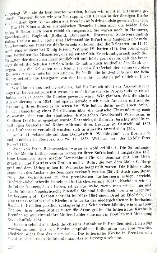 These three questions were also addressed at a conference in Neurippen in the Mark. How these were answered ther we have not been able to discover. Concerning it we hear from Neurippen, that in the church there Grabau had warned in the most stingent of terms about frivolous emigration out of Prussia (23). The two delegates from Buffalo made the most of their 4 ½ month tour. They went to Hannover, Mecklenburg, England, Holland, Denmard and Norway. Understandibly Grabau and von Rohr visited their hometowns of Erfurt and Magdeburg. It is of particular interest to hear that the delegates also had an audience before King Friedrich Wilhelm IV on October 11th (16). Concerning the relationship with Missouri the King said that it was horrible. He inquired about the retaining of German values and characteristics and was happy to hear that these were taught trhough the schools. He also graciously accepted the thanks, which the delegates rendered to the King for giving amnesty to the immigrants who left during his time without being given permission. This means the gracious reception with the King freed the delegates from the police surveillance they had experienced earlier. We could not imagine that their visit would not stimulate emigration, even when they did not carry our direct propaganda, which would have been against the law. We believe that the strong immigration of 1854 and later to America is to be attributed to their visit. In support of this we have in hand a document concerning the German emigration to Wisconsin published by the State Historical Society of Wisconsin in Madison in 1898. There it states that due to reports and conversations with Grabau and von Rohr during their visit to Germany in 1853 many Lutherans were motivated to settle in America (25). On November 4th they departed on the steamship Washington from Bremen and landed in New York on November 24, 1853. What were the results of their trip? (16) Two of the reasons for traveling were accomplished.