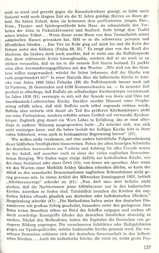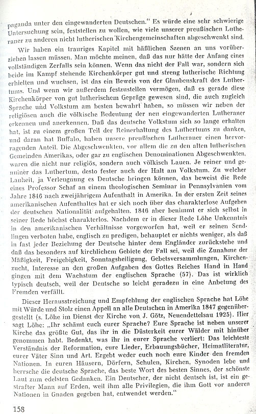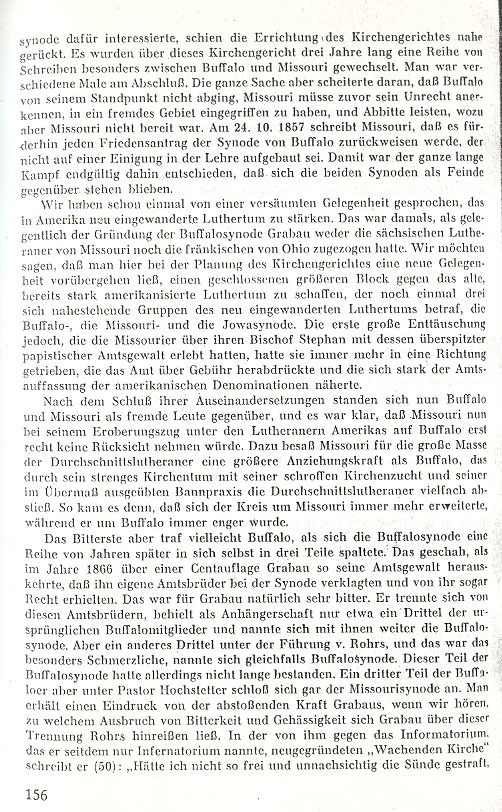 Thus Grabau seems not to have been satisfied with his reception in Prussia. The colloquium in Breslau went against him. Diedrich tried to dissuade him from this. The Lutheran church in Prussia was not as concerned with Buffalo as it seemed to be. With regard to the third mission of the delegation only a a less than meaningful half could be fulfilled. During their many travels the delegates successfully managed among other things, to expose the battle with Missouri as persecution and maltreatment. However they wer unsuccessful in seeing to it that the Missouri Synod be found responsible for all the blame. In Germany they found that the blame for the dispute could be divided between both sides. The second round of battles between Missouri and Buffalo, carried out through his parole, "Tell It to the Church!" and laid out in his calling to Lutheran sister churchs in Europe not only did not settle the conflict but actually heightened it. All further correspondence with Breslau altered nothing. Thus after the European trour we come to the third, most heated and last round of battles. Missouri becomes very angry about Löhe, who now showed friendly inclinations towards Grabau. In the Notwehrblatt (Letters in Self Defense)(66) it is written: "Who stood in closer relationship to LÖhe than us? The eye mists up when one notices that the ecclesiastic communications discuss ever increasing words of fondness for the person who m the holy and righteous God will sooner or later expose in his shame and nakedness, as anyone would feel shame for having said or written a word for his own advantage." Missouri sends an justification to the writers at the Fürth and Leipzig conferences and renews its contact especially with Breslau concerning advice given by Huschke's proposal for a colloquium, which indicated no impediments to conscience for the Buffalo Synod. In the mean time Grabau rejects attendance to this colloquium and says that one would never achieve his end with Missouri in this way. He declared that Missouri was pagan and materialistic (39). He complains, so writes the Missouri Notwehrblatt, that Missouri is renewing its slander against Buffalo through its writings and ultimately puts on the crown of victory in his notorius travel report of 1855, which unfortunately we do not know and he further carries on these vulgar attacks in the Informatorium. One must strip the sheepskin from this disguised wolf. Buffalo operates a devilish fraud and it continue to do so until the hour of redemption sounds for his grieving, deceived children as was once before exposed in a similar hierarchical striving (Stephan) within the Lutheran church in this part of the world. The disguised wolf is driving Buffalo into the ground. Concerning them one should not forget the words of Galatians 5, 12: May God wish that those, who would destroy us, will be destroyed! (66) In reality the hatred couldn't have escalated more than when it ended in a threat of damnation, in a wish for annihilation. Missouri would have seen its threat of damnation fulfilled years later when Buffalo split into factions, in the end substantially having disappeared as a self-standing church body. For the time being however Buffalo still existed and attempted, after the call to the Lutheran sister churches in Europe had failed to make its point, to come to an understanding with Missouri and yet in the long run achieve its goals. This was the establishment of a general church court for the assembled Lutheran churches in America (16). The Church court was established to incorporate the three synods. Besides Missouri and Buffalo the Iowa Synod, established in 1854 was interested in the erection of a church court. concerning this church court there was over a three year period a series of letters exchanged especially between Missouri and Buffalo. Many times they were deadlocked. The entire matter however floundered upon the point that Buffalo would not relent in its opinion that Missouri must acknowledge its injustice of having encroached into territory outside their sphere of influence beforehand, and beg foregiveness, but Missouri was not ready to do this. On October 24, 1857 Missouri wrote that Buffalo had rejected every effort at peace offered by the Synod and no consensus concerning teaching could be reached. Throughout the long hard battle is was decided that the two synods would remain enemies. We have already spoken once of the neglected opportunity to bolster the new immigrating Lutherdom in America. At the time of the establishment of the Buffalo Grabau connected with neither the Saxon Lutherans in Missouri or the Frankish Lutherans in Ohio. We might say that in the planning of the church they passed over another opportunity to create a decisively large bloc with the old, already strong Americanized Lutherdom but instead the newly immigrating Lutherans found three distinct groups, the Buffalo, Missouri and Iowa synods. The first great disappointment, in which the Missourians experienced the hypercritical, papist authority of Bishop Stephan, forever after shaped their direction whereby ministerial office was unduly suppressed and strongly approached the concept of ministerial office prevalent in American denominations. Perhaps Buffalo suffered the most bitter disappointment when years later it divided into three parts. This happened in the year 1866 concerning the penny levy whereby Grabau flaunted his ministerial authority to such an extent that this own brothers in office indicted him at the synod and obtained a certain amount of justice. This was, of course, very bitter for Grabau. He separated from these brothers in office, retaining about one third of the original members of the Buffalo Synod and continuing to call themselves the Buffalo Synod. Another third under the leadership of von Rohr, and this was particularly painful, also called itself the Buffalo Synod. This portion of the Buffalo Synod did not last long. The third portion of Buffal