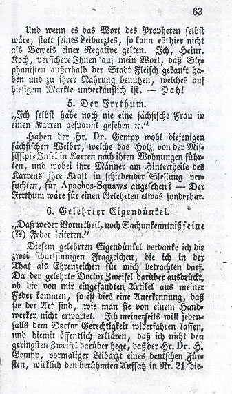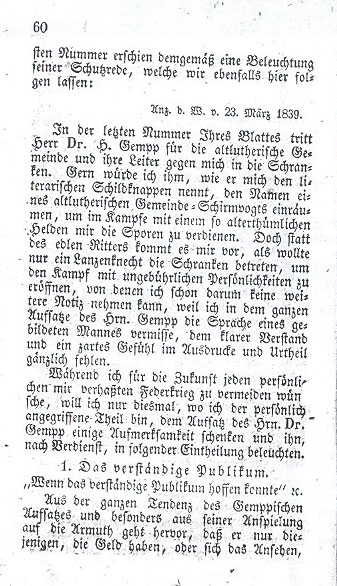 Going back to the external conditions of the Saxon congregation, let me say that it is only a love of truth derived from individual observation which prompts me to write this letter and it is for this same reason that I must tell Mr. H. Koch I consider him an idle scribbler who has not provided any proof that his (??) feather is guided by neither "prejudice nor ignorance to the facts." I would also like to remind him that it's just possible these people, who were unjustly persecuted in Germany by those in civil and religious authority, may be advised to bring suit in the courts for libel and slander. In this case all would have to bring their proofs before the court. If these proofs cannot be provided this group may be advised to sue for damages, usually a hefty sum,in addition to those charges filed by the judge for slander (and libel.)