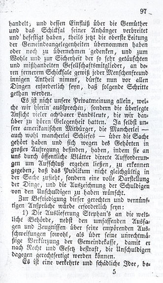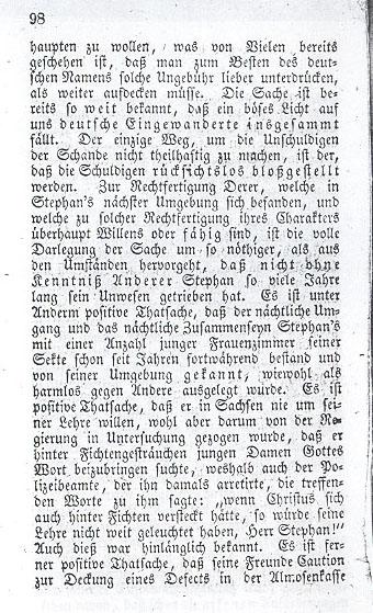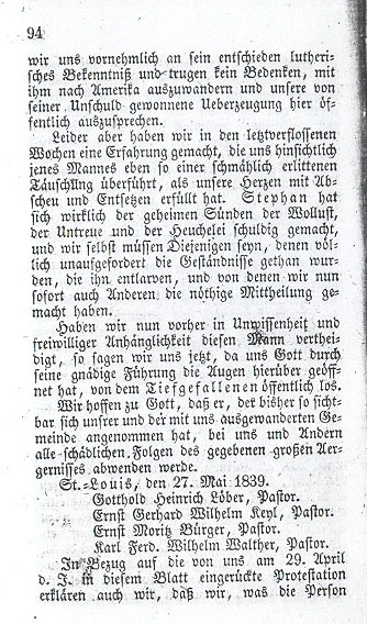 The above published declaration, containing the statements of the injured parties and those directly involved in the affair, confirms what the greater German public on both sides of the ocean has suspected for quite some time. It confirms the latest special reports and indicates that the affair could only have remained hidden for so long because of incredible confusion and intentional blindness. — And in particular it confirms the faithless hypocrisy and blatant tyranny of the "true servant of God," Martin Stephan towards his congregation, the so-called old Lutherans. For twenty years this cunning sinner has known how to