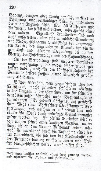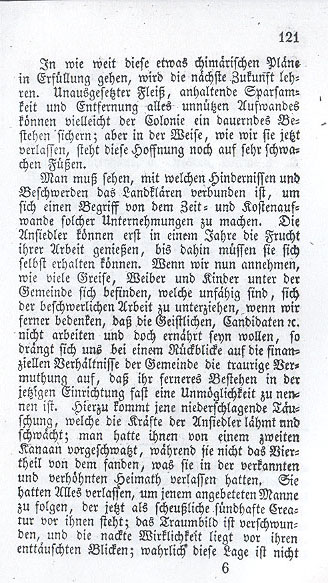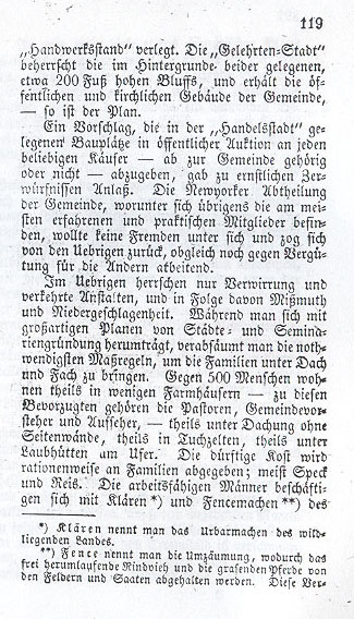 A proposal to publicly auction off pieces of land in the commercial district to anyone regardless of whether they were members of the congregation was rejected because it caused many quarrels. The New York contingent of the congregation, by far the most experienced and practical group, did not want strangers in its midst and would withdraw from the enterprise even though this would be detrimental to the welfare of the other members of the congregation. For the most part confusion and chaos prevail resulting in discouragement and depression. While people are making grandiose plans to establish a city and a seminary, they neglect to take the necessary actions to provide roofs over their families' heads. Of the 500 people living there, some live in a few farm houses - these privileged few include the pastors, the congregation administrators and the overseers. Some live in shelters with roofs but no walls. Others live in cloth tents and a portion live under the cover of trees at the shoreline. The scarce food supply is rationed out to families, mostly bacon and rice. Able bodied men work mostly at clearing the land * and putting up fences ** _____ * Clearing the land refers to deforesting and preparing the land for cultivation. Return to text ** A fence is an enclosure erected to keep cattle and grazing horses from roaming the open range and the cultivated fields. [Remainer of footnote from page 120] Naturally these structures must be fairly high and they are quite costly and time consuming to build. Return to text |