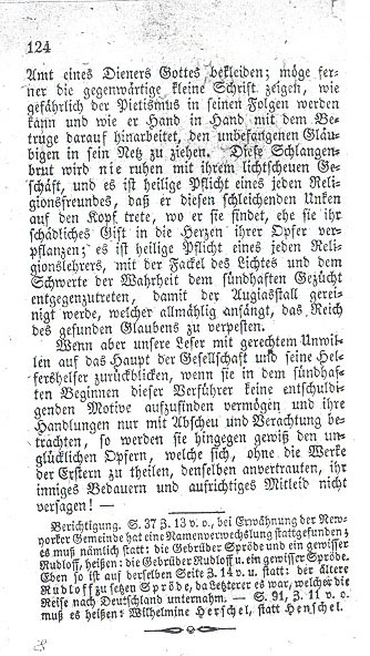 However when our readers look back with displeasure to the head of the congregation and his helpers' helpers, when they can find no pardonable motives in the sinful initiatives of these seducers and can only deem their actions with horror and distain, they will most certainly feel sympathy and regret for the unfortunate victims who were innocent of any wrong doing! Corrections: Page 37 line 13 from the top. In mentioning the New York congregation 2 names were switched. Instead of "Brother Spröde and a man by the name of Rudloff" it should read Brother Rudloff and a man by the name of Spröde. The same mistake occurs on line 14 from the bottom. Where it states "the elder Rudloff" replace the name with Spröde. It was this latter man who took the trip to Germany. Return to text Page 91, line 11 from the top. The name is Wilhelmine Herschel instead of "Henschel." Return to text |