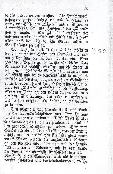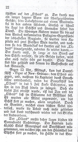 In the early hours of Friday, January 18th the Olbers neared the mouth of the Mississippi River. During the night the helmsman had taken the ship too far in so he had to turn it back since it would have been dangerous to proceed without a pilot on board. Finally around 9 AM the pilot's boat arrived. The pilot jumped into a skiff and the oarsmen, sturdy black men,